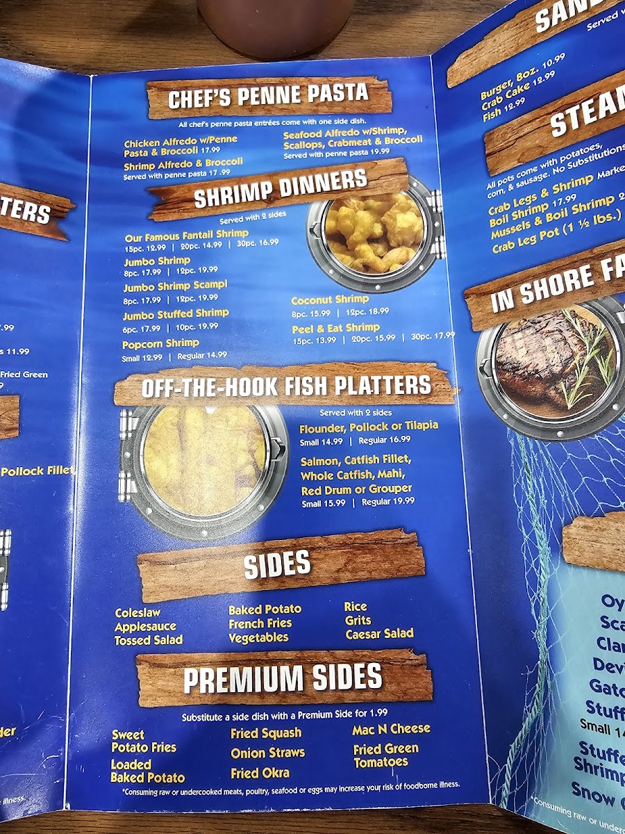 Choose any 4 from: Shrimp, Popcorn Shrimp, Scallops, Clam Strips, Tilapia or Pollock Fillet, Devil Crab, Chicken Strips or Oysters